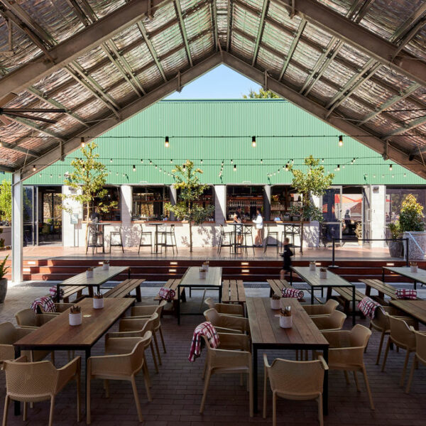 The courtyard is part of an overall set of outdoor spaces that overlook the nearby river — giving a relaxed, “open-air + water + greenery” vibe.